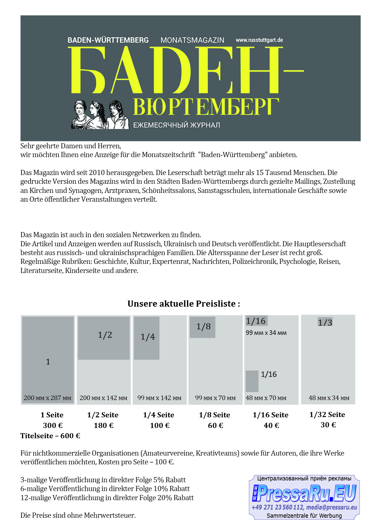 Цены на размещение материалов значительно ниже, чем в немецких изданиях. Статьи и реклама публикуются на русском, украинском и немецком языках. Все материалы авторские.