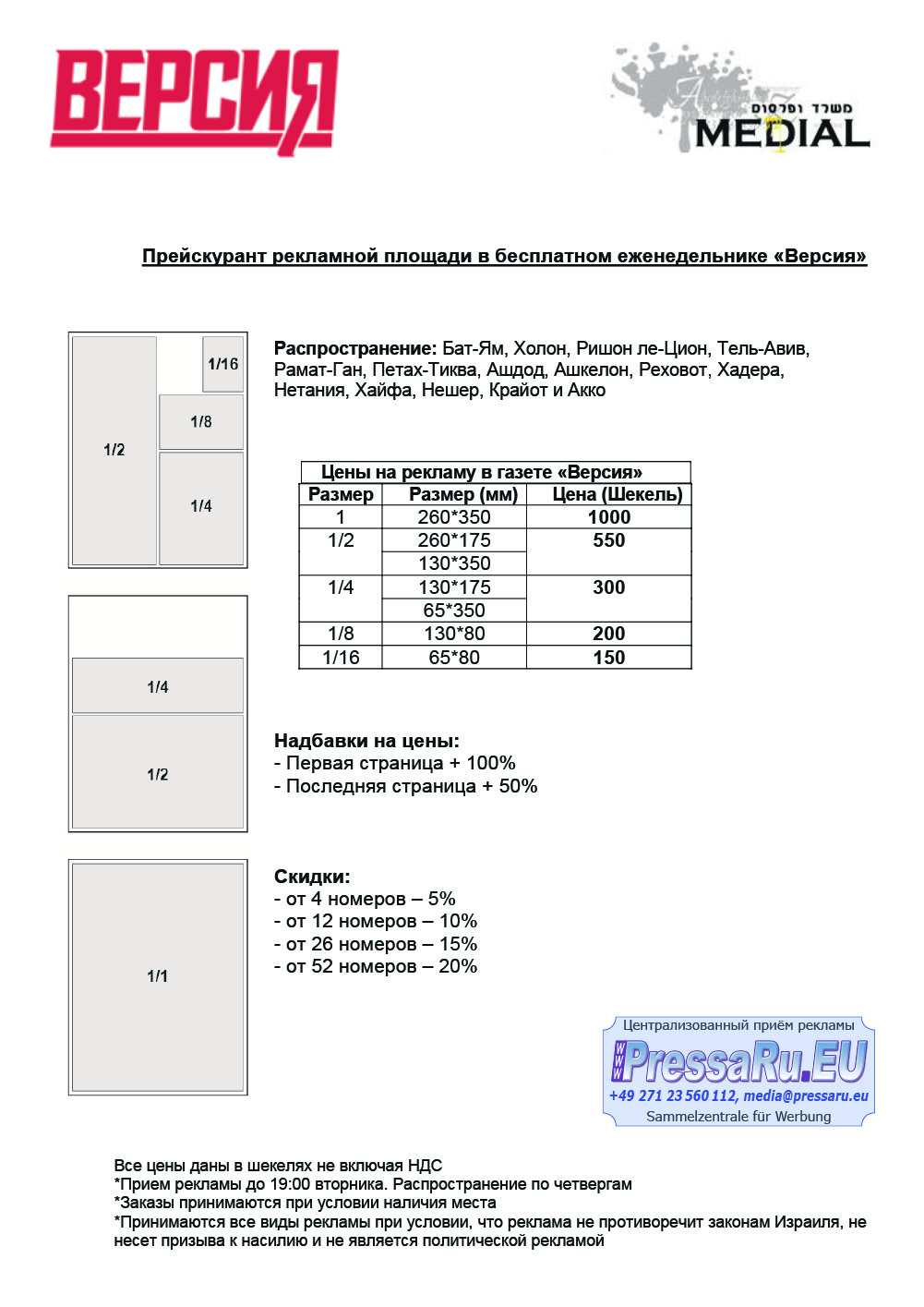 Цены на размещение материалов значительно ниже, чем в израильских изданиях. Статьи и реклама публикуются на русском языке.